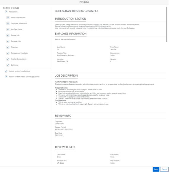 When the user clicks the Print button, a popup displays a preview of the form. This provides the user the opportunity to select the entire form or selected sections to print.