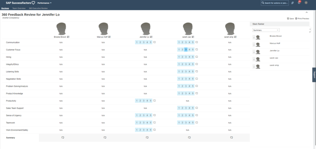 Stack Ranker can be enabled which allows side by side ranking of employee competencies. Ratings may be modified and comments added.