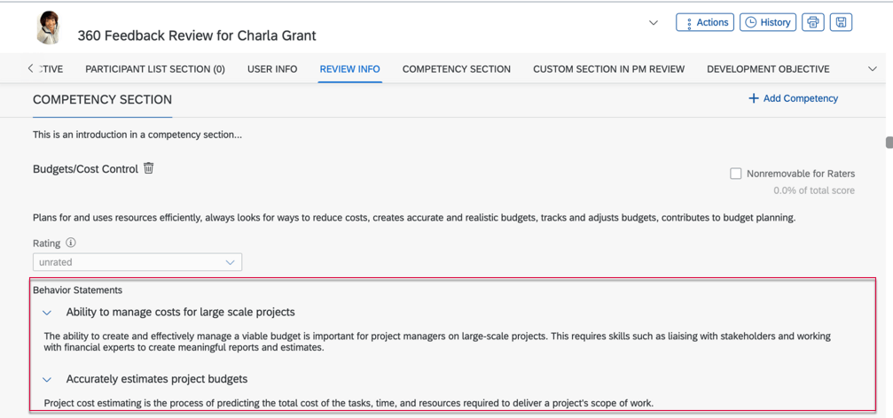 If competencies have behaviors associated with them, behavior descriptions may be included in the Competency section of a 360 multi-rater form, even if the behaviors are not being rated.