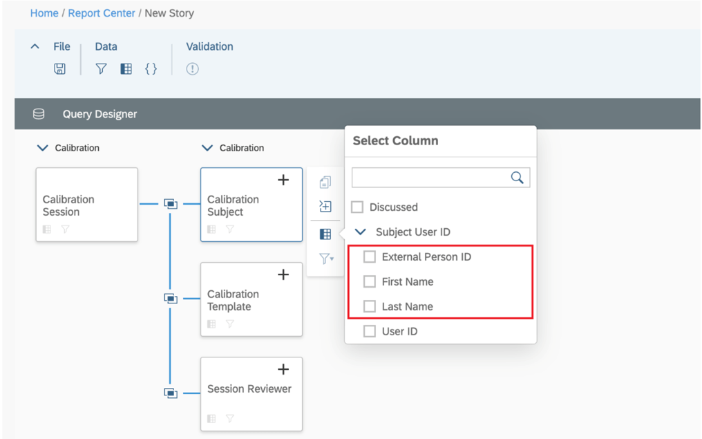 You can now include the name and external user ID of a session subject in a Story report. The first and last names and external user ID are supported in the auto-joins for calibration subjects. This makes it easier to get calibration subject information.