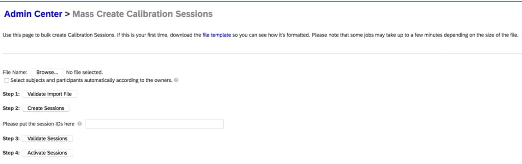 There are four steps to perform on this screen: validate the import file, create sessions, validate sessions and activate sessions. The admin will receive an email after each step with with any errors or warnings. If there are any errors, they must be corrected before moving on the next step.