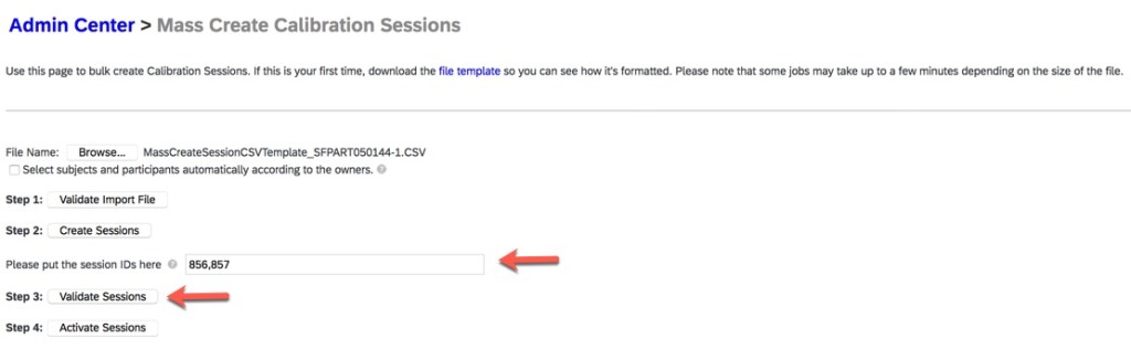 The admin will need to return to the Mass Create Calibration Sessions tool to validate the sessions. Make sure the file name is listed along with the session IDs from the e-mail from step 2. Click on the step 3 button, Validate Sessions. An example is shown below.