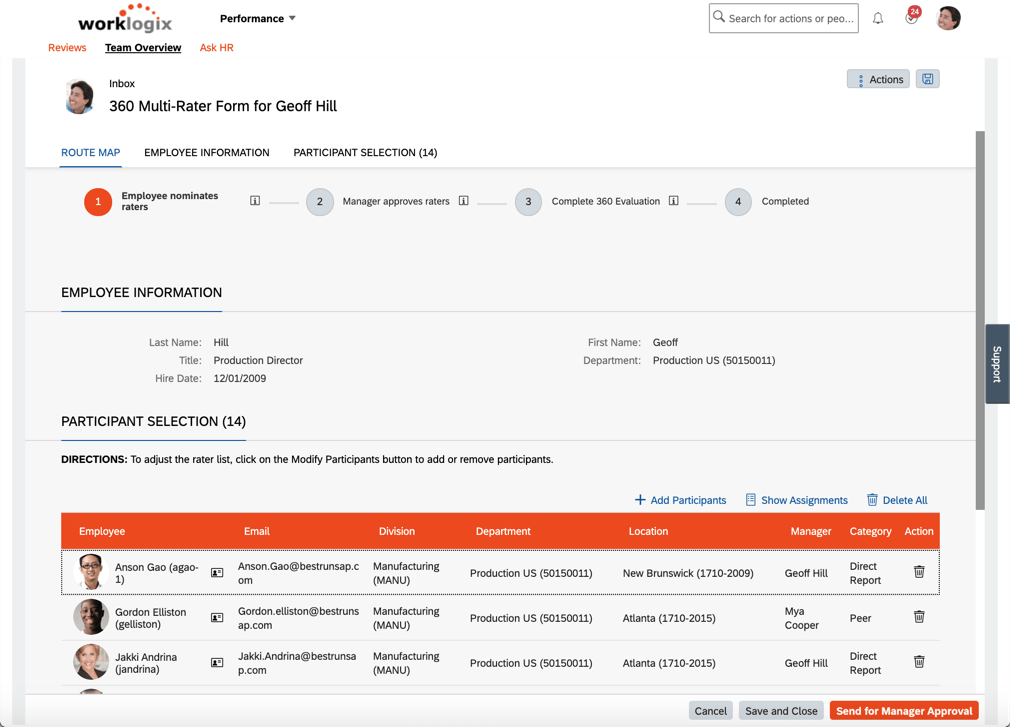 Once the first person in the route map gets the form (in this case the employee), they need to choose who will be involved in the evaluation. The system can be configured to default in people for categories like direct reports, manager, and peers.