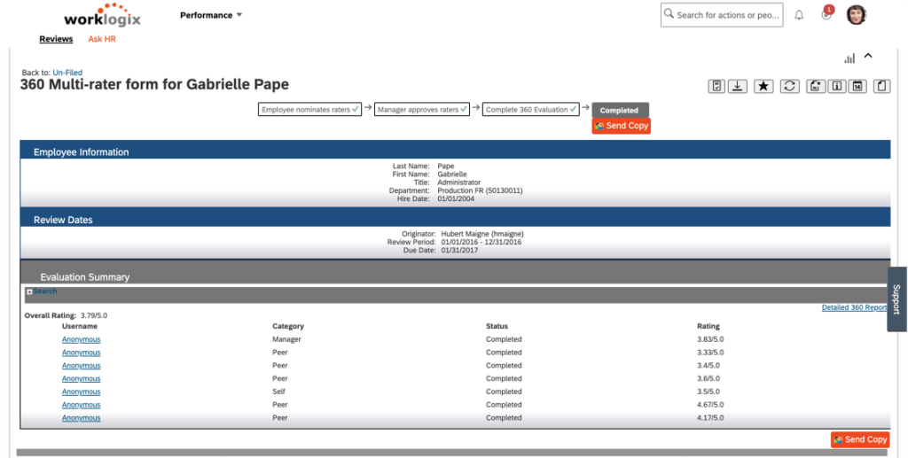After all evaluations have been completed, the form is put in the completed status and the employee / manger / etc can view the results depending on permission settings. You can see an example completed performance form below.