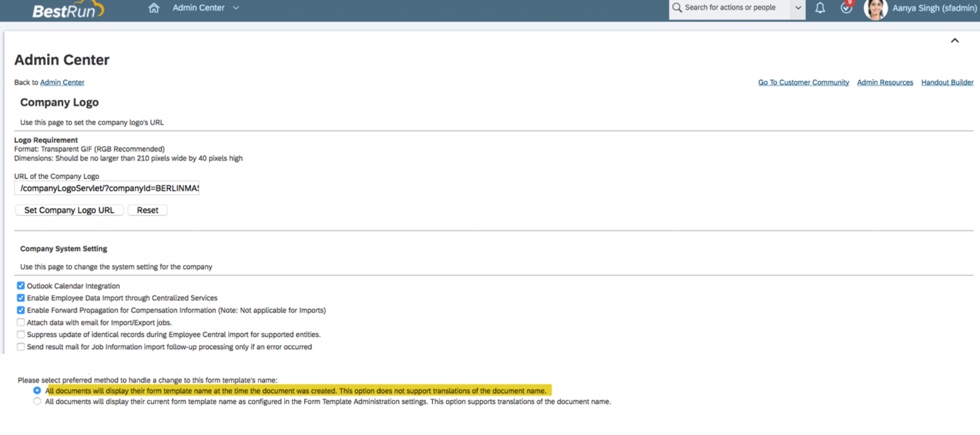 If “All documents will display their current form template name as configured in the Form Administration settings. This option supports translations of the document name.” is enabled, the form will not contain the target role name.