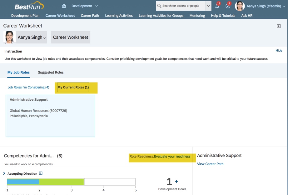 After the updated Career Worksheet XML is imported in Provisioning, the Current Roles tab will contain a link to evaluate readiness.