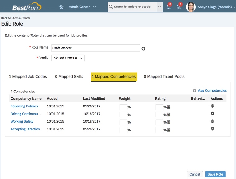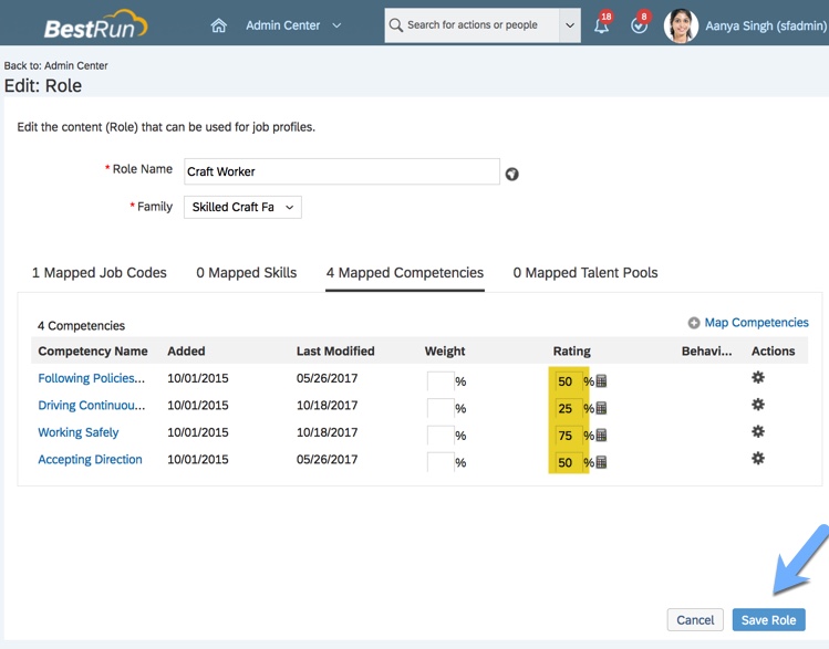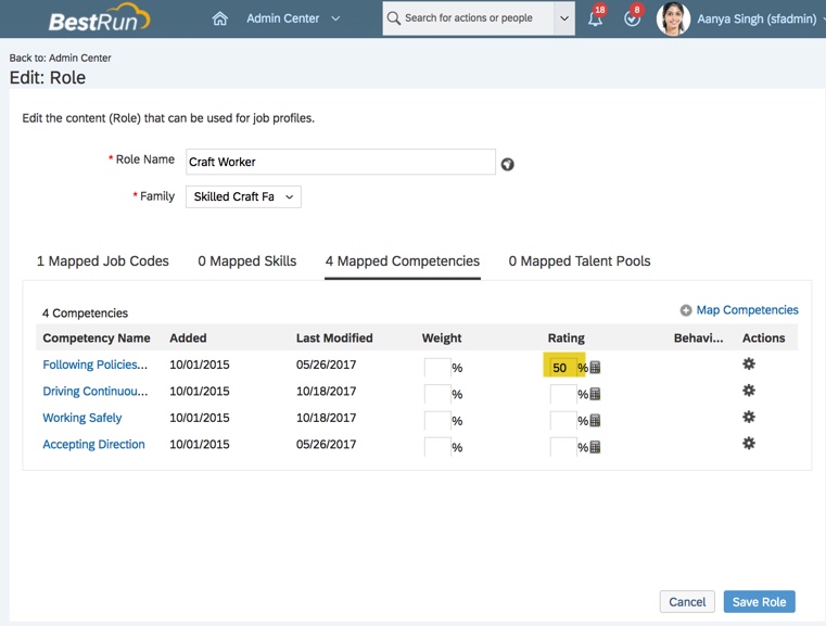 Continue to create the expected rating for each competency for the role. Once all of the ratings are populated, save the role.