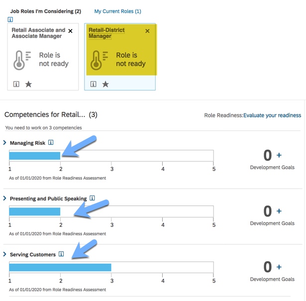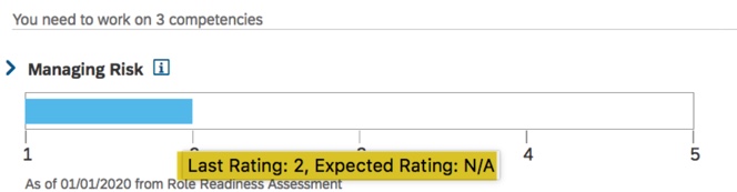 If any of the roles being considered have mutual competencies, the readiness meter will populate for all of them after a role assessment is completed. In other words, if an employee has selected a few targeted roles that share a competency, when a role readiness assessment form is completed for one of the roles, the readiness meter will calculate readiness for any other targeted role that has the competency. Since expected ratings can vary by role, the same competency might display different gap values for different roles.