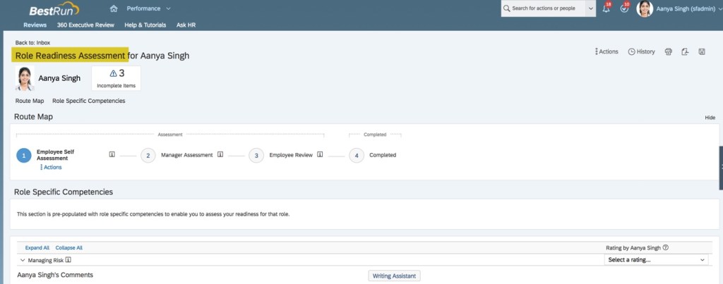 Proxying as the employee and trying to launch the Role Readiness Assessment form. This is a self-assessment function and the action is not supported by proxy feature. So, the “Evaluate your Readiness” link will only appear to the logged-in user directly (it will not appear if you are proxying as the user).