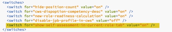The Career Worksheet XML can be configured to allow employees to launch the Role Readiness Assessment form for their current role. This is accomplished with the following switch added to the Career Worksheet XML.