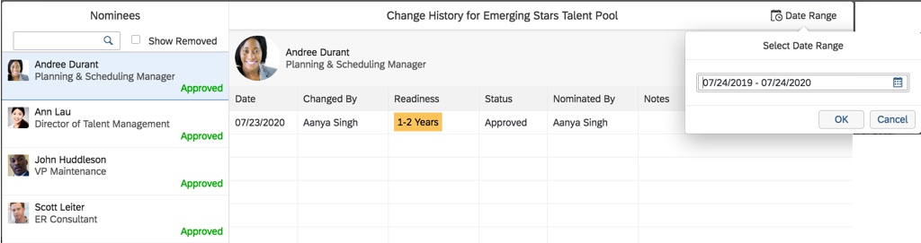 The name of the user that made the change will display along with the change date. The readiness, status, nomination source and notes for each change are displayed as well.