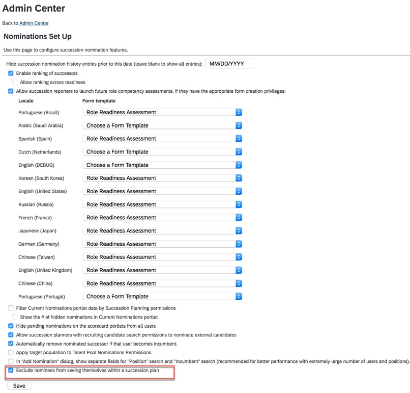 Let’s see how to enable this feature. Go to “Nominations Set Up”. Scroll to the very bottom of the screen and enable “Exclude nominees from seeing themselves within a succession plan”. The “Nomination Set Up” page is shown below.