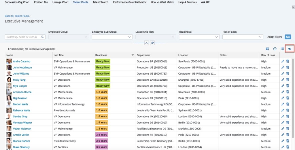 Within a talent pool, there is new icon used to view nomination history for each nominee. The example shown below identifies the icon which displays on the top right side of the talent pool table.