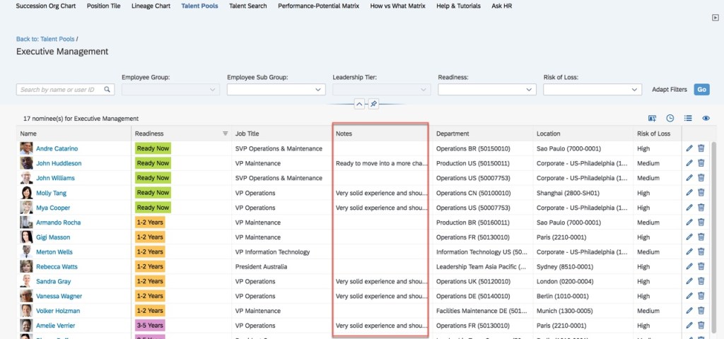 First, there are more lines available in a talent pool nomination table view as seen below. This update also includes making the line width consistent with tables in other modules.