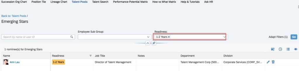 After the final nominee is deleted from the talent pool, the readiness filter is cleared as seen below.