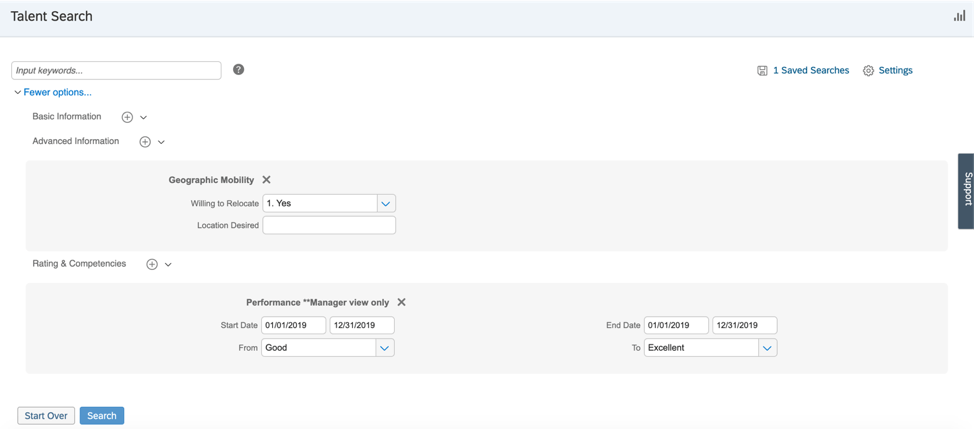 Another way to search across the company for people flagged as for Risk of Loss or Impact of loss—or any other talent field for that matter, is the Talent Search. This is the one-stop-shop for all talent info on your employees! Things like past performance ratings, skills and languages and degrees pulled from the talent profile are all here as well. Talent pools can also be made with the search results to help you organize your talent! There are all sorts of practical applications for Talent Search – for example in the search query I have made below, the results would show me all of my Good to Excellent performers for this year who are also willing to relocate—great information to have on hand when you have a critical position that is empty in a hard to fill location!
