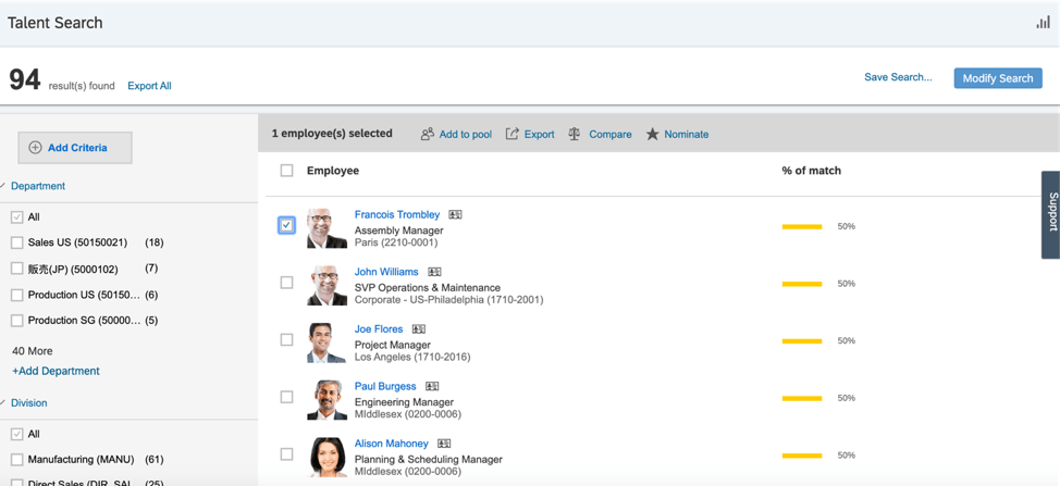 In addition to adding resources to talent pools, from here you can also nominate them for positions and also compare how well they stack up against one another in your search (is it just me or do Francois and John look related?)