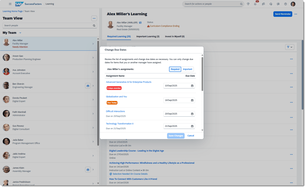 Managers can now change due dates for manager-assigned learning items directly from the Team View page—individually or in bulk. The new Change Due Dates dialog provides a quick way to update deadlines with real‑time status updates. This improvement streamlines manager oversight and supports better learner compliance.