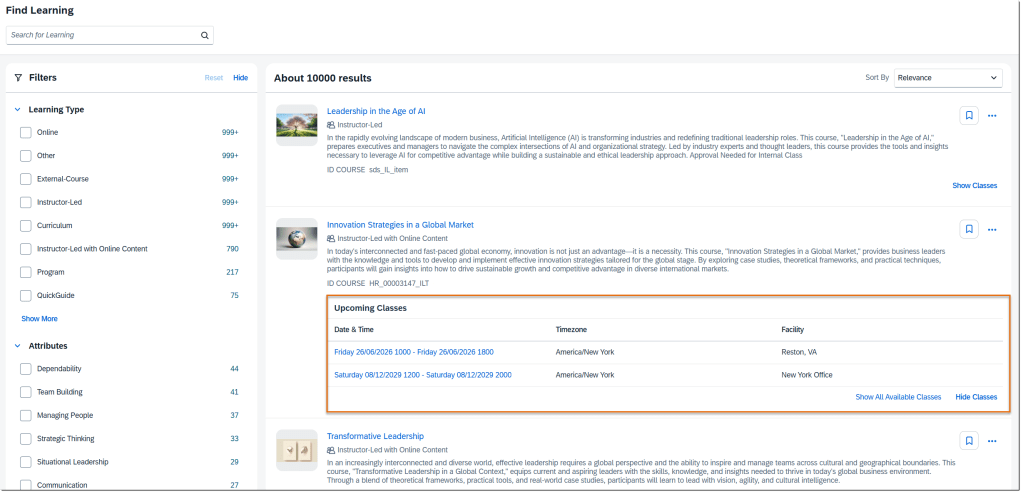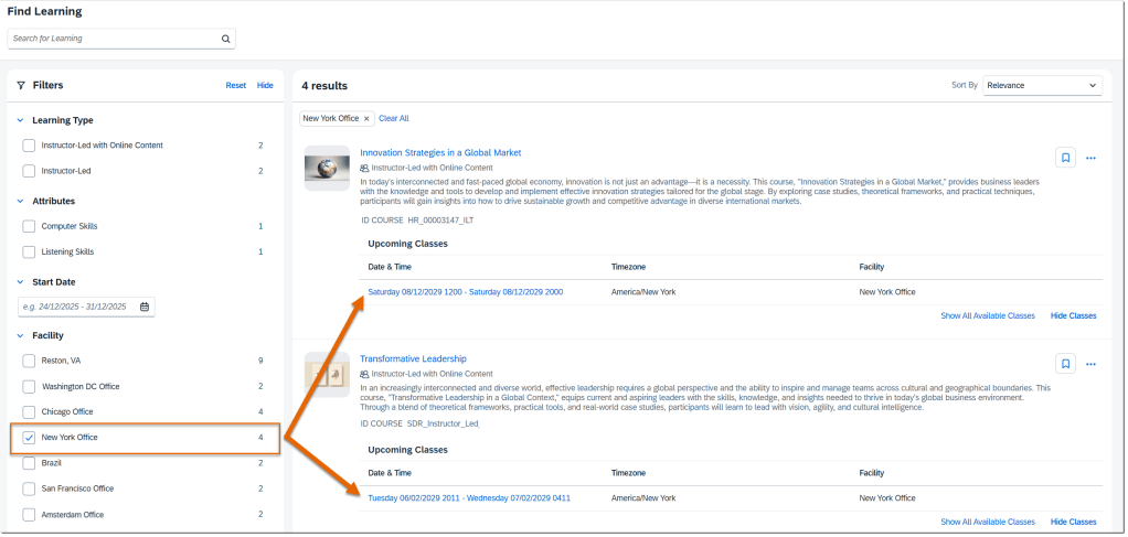 Learners can now view and expand upcoming classes directly in enhanced search results. The list shows up to five classes sorted by date, updated dynamically when filters like Facility are applied. This replaces the old calendar view and allows quick comparison of class schedules and locations.