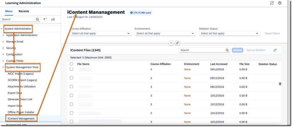 A new iContent Management page allows admins to identify and bulk delete unused files from iContent servers. You can schedule deletion jobs, view usage, and manage associated courses efficiently. Only one deletion job can be scheduled at a time and must be planned 30 days in advance. This helps optimize storage and maintain cleaner repositories while ensuring admins can revise or reactivate impacted courses as needed.