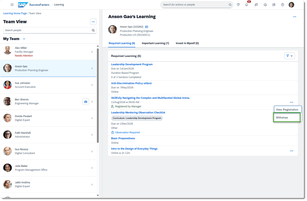 Managers can withdraw learners from classes seamlessly via Team View. Using the More Actions menu or directly on the Class Details page, managers can execute withdrawals without relying on bulk tools, improving flexibility and speed.